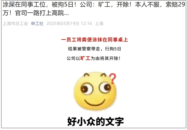 涂屎在共事工位被拘5日!公司:开革!自己不平讼事一起打上高院 争议旷工认定涂屎在共买球平台官方网站事工位被拘开元娱乐棋牌官方网站5日,公司欧洲杯买球正规官网,开革,自己不平讼事一起打上高院2025-03-20 09:03:43